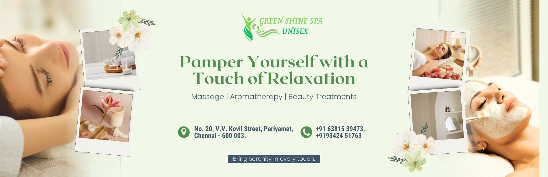 We, Green Shine Spa Unisex, situated at No. 20, V.V. Kovil Street, Periyamet, Chennai – 600 003, offer a variety of unisex spa services. Our spa features wonderful, highly trained, and friendly staff ready to pamper you with our relaxing treatments to enrich your senses and de-stress your mind, body, and soul. Our welcoming staff and serene environment ensure you relax away from the city’s hustle and bustle.